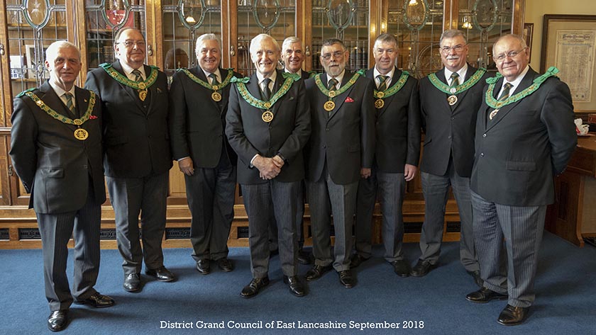 | The purpose for the gathering was The East Lancashire Provincial Grand Council Meeting held at the Masonic Hall, Richard Street, Rochdale on the 8th. September 2018. and at 11.00 a.m. The District Grand Director of Ceremony Worshipful Brother Peter Hegarty Past Grand Standard Bearer welcomed us to District Grand Council and called the meeting to order. He announced the first of two processions, the first being the visiting District Grand Prefects of other Provinces and the second The District Grand Prefect of East Lancashire Right Worshipful Brother Mervyn Frank Wilson accompanied by his District Grand Officers. The District Grand Prefect was escorted to his Chair In District Grand Council and salutations were given to which he suitably responded. |