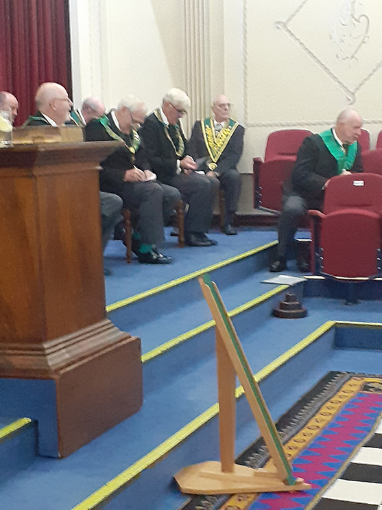 | Anyway, East Midlands had also thought through the way of accommodating the large numbers in the Lodge Room in these covid challenging times. Well-spaced seating, the room in a pristine condition and some of the usual processions dispensed with to prevent Brethren crowding together. The meeting went well, the DGP for East Midlands leaving his pedestal to make District appointments at the individual recipients’ station, which was a new innovation for me, and quite correct and well done in the circumstances. | ||