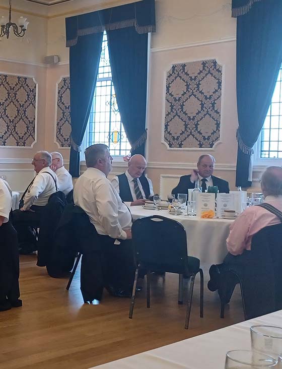 | Back to the main business, as always, you’re guaranteed a warm welcome at the East Lancashire meeting, and boy was it warm. Even so, a bacon barm and a cuppa are always welcome, and these were in plentiful supply and helped set up Brethren for the day. It was good to meet up with many Brethren and have a chat. One particular one springs to mind, a poor farmer in fact, whose claim to fame was being stopped and questioned in airport security (on the way to an Allied District meeting in Southampton). The security officers couldn’t work out what an item in his basket was, and which turned out to be an ancient mobile phone. There was much hilarity among Brethren as he was closely questioned and searched by 3 disbelieving security personnel in the process. A true story to which a number of West (and East) Lancs Brethren bore witness. Well, I’m sad to tell you that the said mobile phone has recently turned up its electrodes and now resides in that great circuit board in the sky, ahh! The poor farmer proudly revealed to me its replacement, which I couldn’t believe was virtually the same model and vintage as his last one, he said it was all he could afford, ahh. All I could say to him was not to go near airport security with the phone, or he may be down to his socks pretty quickly! |
