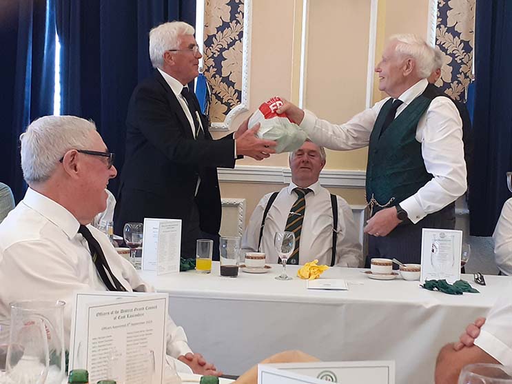 | The DGP for East Lancashire was fulsome of his praise to guests who had travelled from far and wide to attend the meeting, but not a mention of his favourite sport ‘Ferret Legging’ (you will have to read a past report if you don’t understand this underrated activity). During his speech, Mervyn had a special surprise for the DGP of West Lancashire. Bramley apples are known as the best baking apples, and Mervyn knew that these were relished by Paul. So, Mervyn arranged to obtain some of these apples from a neighbour, a bag of which were then presented to Paul at the meeting. What a nice touch which demonstrates the close association of the neighbouring Districts. |