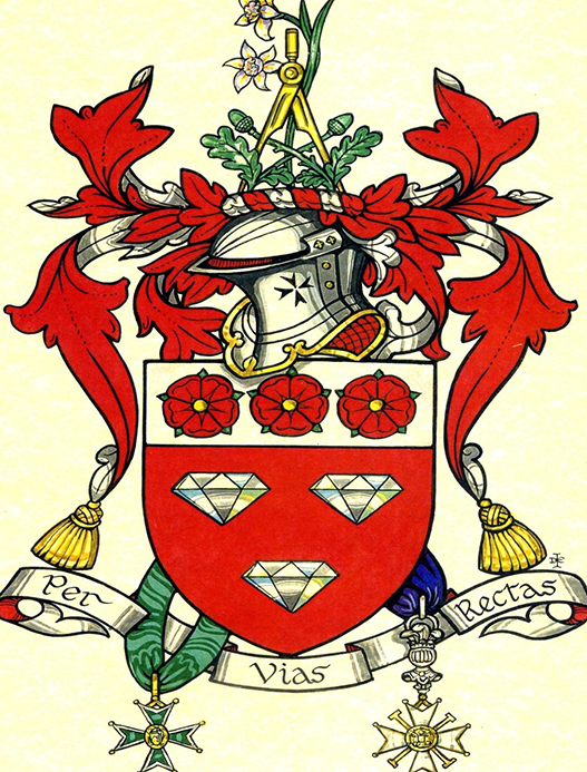 | The GM circulated copies of the Rhodes Coat of Arms around the Lodge room, which had been designed by the Lancaster Herald for David, and granted by the Earl Marshall of England on behalf of the College of Arms. A unique twist to David’s Coat of Arms is the incorporation of a Compass at the top, to signify air and sea navigation, but I’m pretty sure that this was also meant to reflect his love of all things Masonic! |