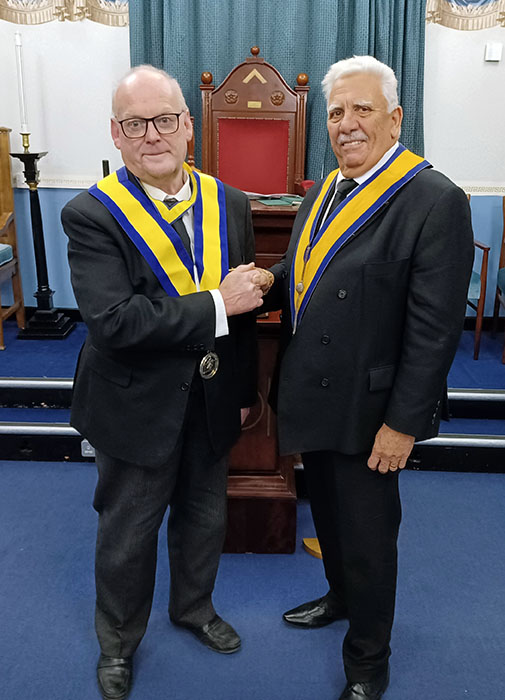 | Following various items of business on the summons, the WM, Bro. John Cunliffe, then announced that the next business was to invest the ME, Bro John Barnes. He thanked Brethren for all the support over the past year and hoped that the same support could be given to the ME. Installing officers were then conducted to their seats by the DC. |