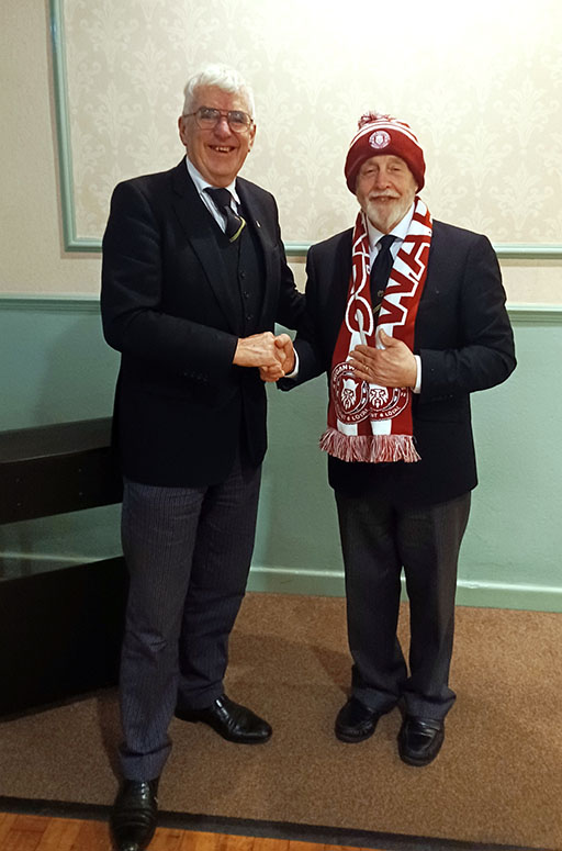 | On a lighter note, the DGP also surprised everyone at the Festive Board, including the recipient, by making a presentation to W. Bro Pye to mark his impending retirement as DGDC. The presentation comprised of a bob cap and scarf of the Wigan Warriors Rugby League club, which anyone who knows Ray will be aware that this is his sporting passion. For the uninitiated, rugby league is a ball handling game which usually resulted in a gladiatorial contest between two teams, comprising 13 players each. The object of the game in the old days used to be concerned with how many players remained on the pitch, as much as scoring points. Ritual near decapitations resulting from stiff arm tackles, or from the use of heads as drilling rigs following spear tackles were the order of the day. Ah the good old days, not allowed now, television replays have sanitised rugby, bah, humbug! If you don’t believe me about the ferocity of the game in years gone by, turn up a clip of the ‘Battle of Fartown’ and then you’ll believe! |