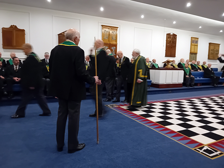 | The Grand Master was offered the Gavel on entry, and on this occasion agreed to accept it and occupy the Chair for the purpose of Investing the new District Grand Prefect. The new DGP, Brian Benjamin Williams,went on to invest his Deputy, W. Bro Graham Samuel Kirby PGStdB, and on completion of these formalities, The Grand Master processed out of the meeting accompanied by his Officers. |