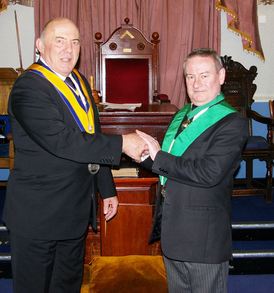| The next business was the Installation as Master of Bro. Ron Pearson, for which purpose W.Bro. Mike Hatton invited the Deputy D.G.P. W.Bro. Paul Snape to occupy the Chair and conduct the Ceremony of Installation. |