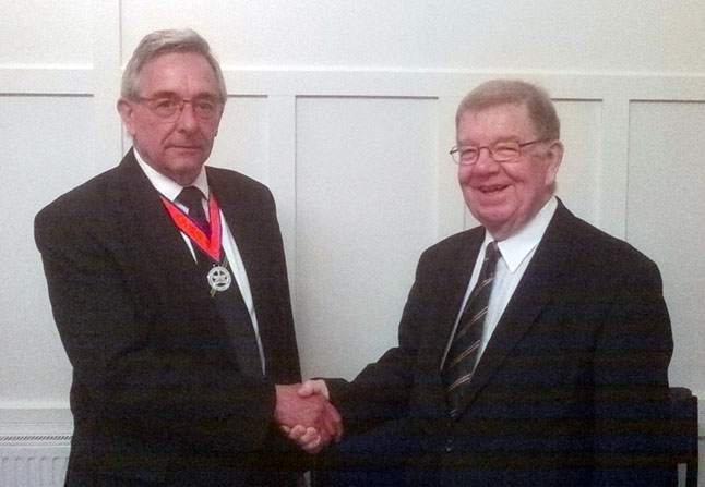 John Torrance being congratulated by Michael Davies on becoming Master. |