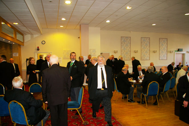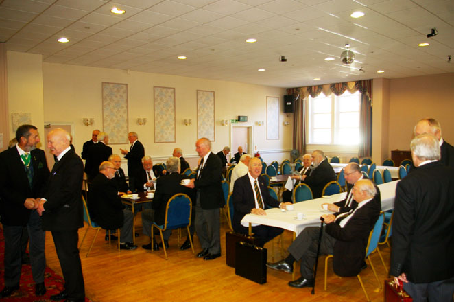 | Arriving at Chorley Masonic Hall Bacon Barmcakes and a refreshing cup of Tea or Coffee were available and were enjoyed by all present. As usual there was a large deputation from the District of East Lancashire as well as deputations from our neighbouring Districts of Cumberland & Westmorland, Northumberland & Durham, Yorkshire, West Midland, Severn, East Anglia, Kent and Southern Counties. Whilst many were enjoying refreshments W.Bro. John Forster and his team of D.C.'s were busily schooling the team of District Officers prior to the meeting. |