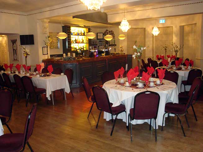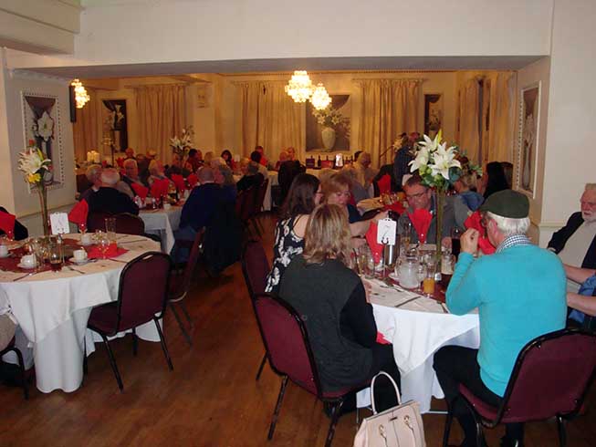 | During a break in the entertainment, everyone then enjoyed Traditional Cuisine: Hot pot and Mushy Peas accompanied by Red Cabbage & Beetroot, followed by Apple Pie & Custard. |