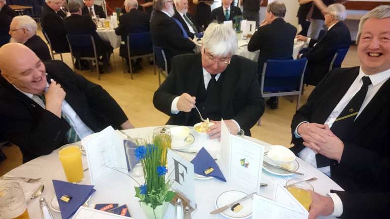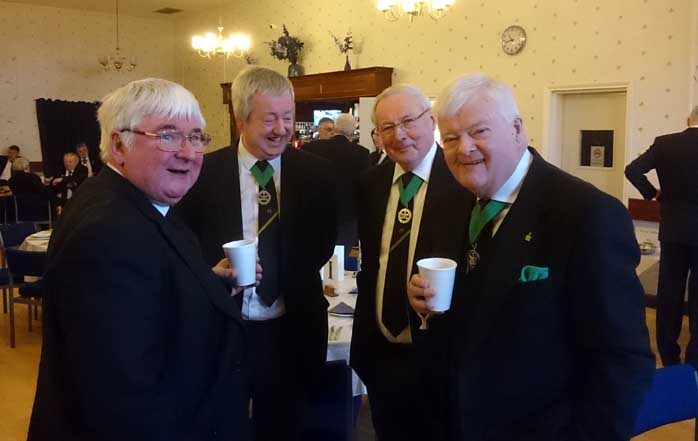 | Arriving at Gateshead Masonic Hall in good numbers they were welcomed by Peter Croft the District Grand Prefect following the welcome they were able to meet friends and share a welcome cup of tea together with a plentiful supply of biscuits and Bacon Barmcakes. |