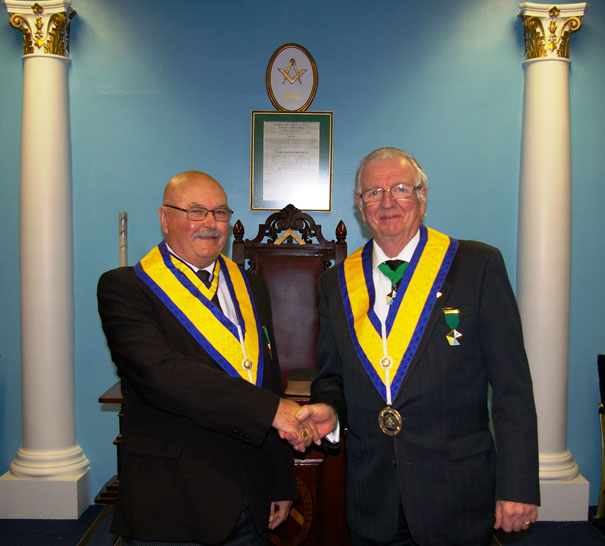 | In reply W.Bro. John Dawber thanked the District Grand Prefect for his generous comments, then he thanked everyone present for their support and encouragement making particular mention of his lifelong friend and guru Peter Schofield. |