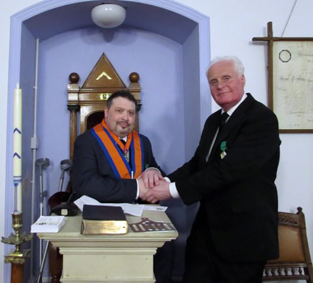 | After the main course as it were, we were treated to an excellent dessert, the presentation of a Grand Council Certificate by the District Grand Prefect which was carried out in a manner we have come to expect from our leader. His work not being completed he gave greetings on behalf of the Grand and District Grand Officers present. |