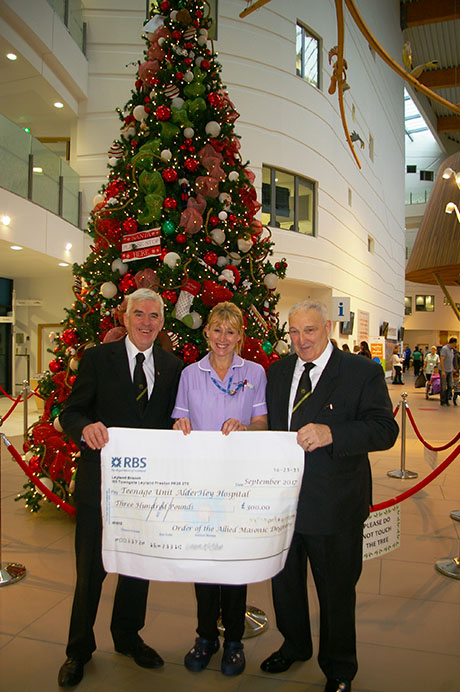 | On behalf of the Allied Masonic Degrees a donation of £300.00 was made to the Teenage Cancer Unit, at the same time Paul and Nat were able to pass on other donations, one of £150.00 from Big Bill's Pig Club, added to the other donations the full total was £950.00. |