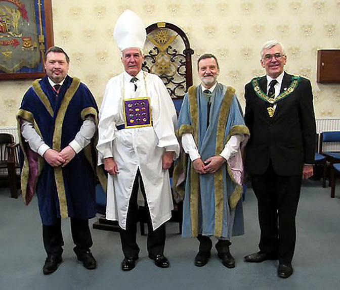 The Lodge Room having been prepared earlier the Most Excellent President Worshipful Brother Paul Renton Past District Grand Senior Warden opened a Convention of the Holy Order of Grand High Priest. On an alarm Companion Clarke was admitted into the Lodge and Anointed, Consecrated and Set Apart to the Office of High Priest for and on behalf of sixteen other Candidates. W. Bro. Renton was assisted in the Ceremony by W. Bro. Catterall and Brother Marc Goldsworthy the Worshipful Master of Thomas Firth Jackson Council and David Lamb Council (E.L.). W. Bro. Renton also delivered the Lecture of the Order, the Most Excellent President then closed the Convention of the Order of Grand High Priest bringing an end to the mornings labours. |
