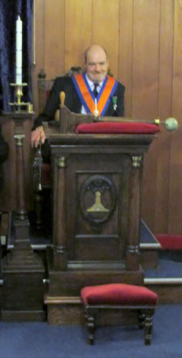 The next item of business was to Admit into the Degree of Masons Elect of Twenty-seven and Created Grand Tilers of Solomon Brother Peter Schofield and Brother Barry Fitzgerald. The room was prepared for a Grand Tilers of Solomon Ceremonies and the Acting Director of Ceremonies W. Bro. Ray Lamb conducted the ceremony assisted by Very Worshipful Brother Stuart Leach Past Grand Registrar and Worshipful Brother Stephen Pemberton Past Grand Junior Deacon. The Lecture in this Degree was delivered by Worshipful Brother Ernest Gavan Past District Grand Junior Warden / District Grand Sword Bearer in his own inimitable manner (modestly he wrote). |