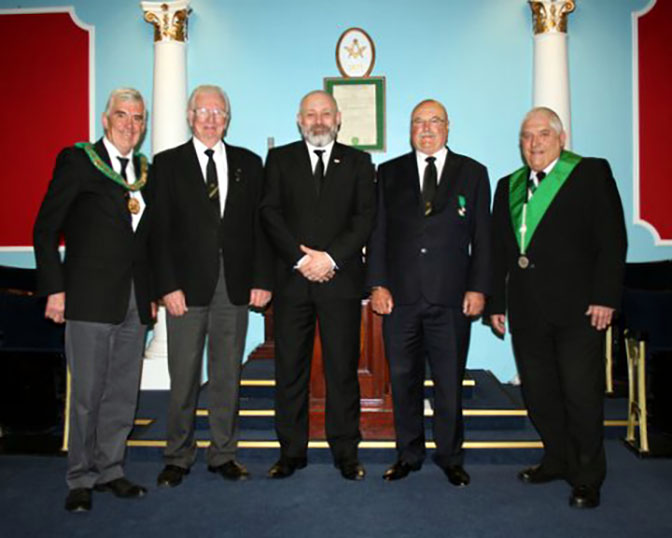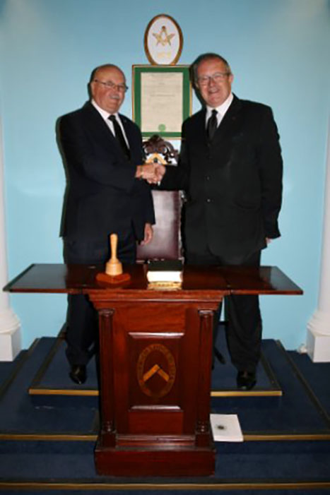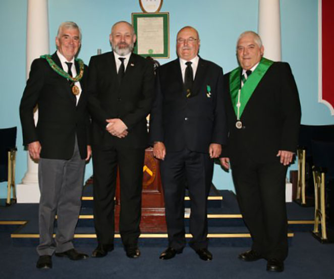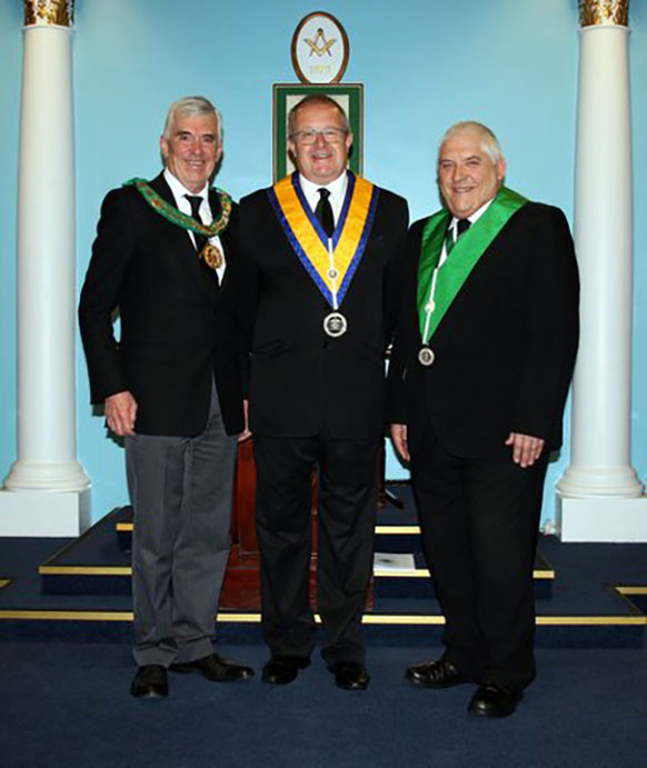 | The Council Director of Ceremonies Worshipful Brother Raymond Pye Grand Steward / District Grand Director of Ceremonies called the brethren to order and the acting Worshipful Master Worshipful Brother John J.Dawber opened the Council at 6.30pm. Salutations were given with suitable responses. The domestic business was concluded and on a report the Assistant District Grand Director of Ceremonies Right Worshipful Brother Douglas John Forster Past Grand Junior Warden escorted the representative of the District Grand Prefect into the Council and introduced him to the Worshipful Master. W.Bro Emmett was escorted to a seat in the Council. | |