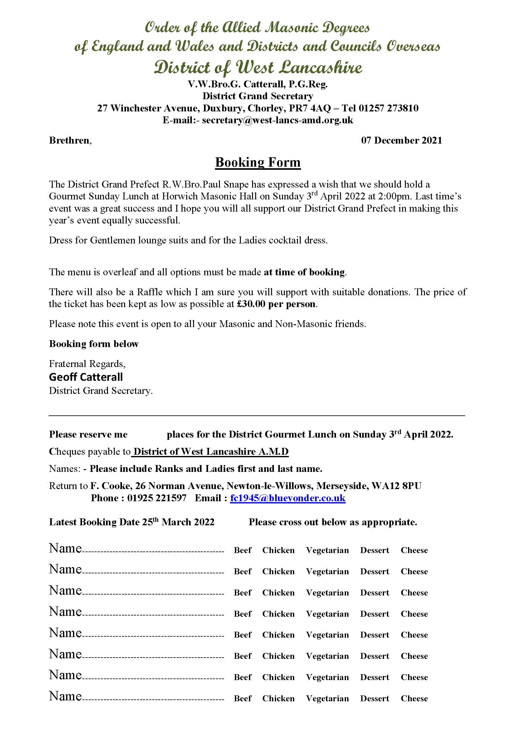 Down load booking form here