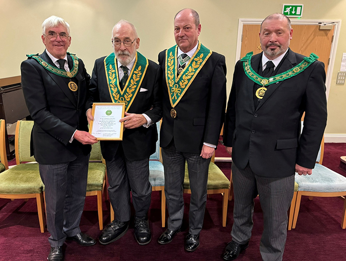 | The reason that the Grand Master, together with the District Grand Prefect for West Lancashire and his Deputy, and around 40 Brethren, had made the effort to assemble at Palatine Council, was to honour VW Brother David Keith Rhodes PGReg, who has been a member of the Order of the Allied Masonic Degrees for 50 years, a truly outstanding service to this order. |