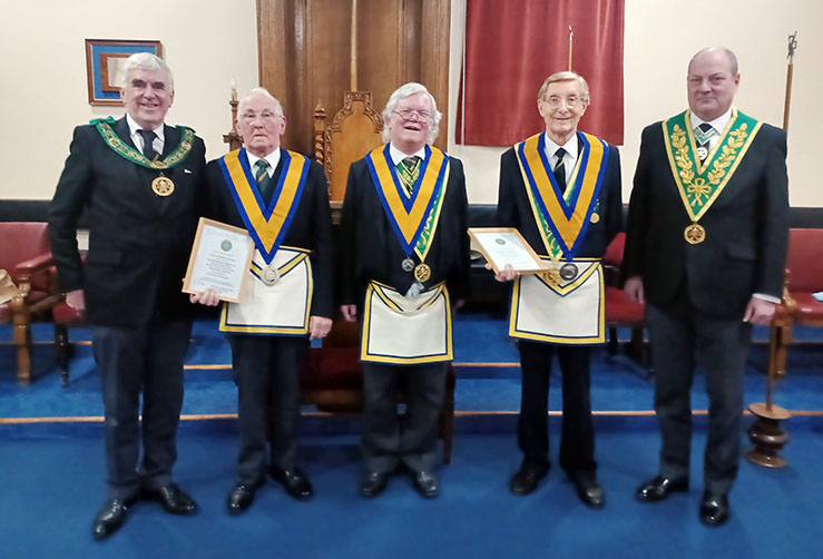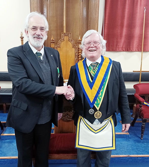 The DGP then instructed the DGDC to present VW Bro Peter Mason and Brian Sager to him, and they were seated on his left. The DGP then went on to explain, that District DGP’s had recently been given permission to celebrate the service of Brethren who had been members of the AMD for 40 years, and that both Peter and Brian had exceeded this tenure. He went on to give a resume of their service to the Order, and then requested the DepDGP  to read out the contents of framed District Certificates. The DGP then vacated the Master’s Chair to warmly present the signed certificates to each of the recipients in turn. The DGDC then requested all present to stand to order and salute the two recipients with the salutations of the Degree 5 times. The recipients, still a little surprised at this turn of events, rose to acknowledge the salutations, and to thank the DGP for the honour.