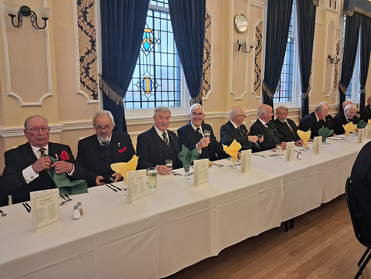 The meeting being concluded in due form, Brethren processed out of the Lodge room in a dignified way, and, following a visit to the bar, the dining room was filled to capacity for an enjoyable meal. A minimal amount of after dinners speeches concluded the proceedings. |