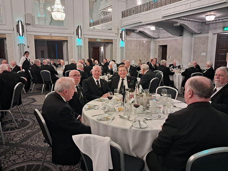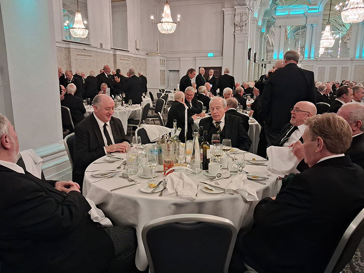 | Following the Council being closed once again in ample form, Brethren made their way out of the auditorium and onwards to dinner in the Connaught Rooms. Unfortunately, on this occasion the 20 plus West Lancs Brethren were seated on 3 tables, one of which was some distance from the others. Still, this didn’t spoil our enjoyment and the food was quickly consumed and wine bottles emptied amidst plenty of chatter and laughter. |