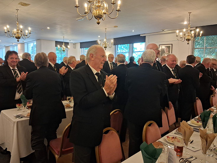 Around 160 masons attended the event, and as a result the festive board was filled to overflowing. A hearty feast commenced with a prawn cocktail starter, followed by Gammon with trimmings main course, and completed by a strawberries and cream dessert. The usual after dinner speeches were kept short but sweet, and soon we were retracing our steps back to God’s Country. |